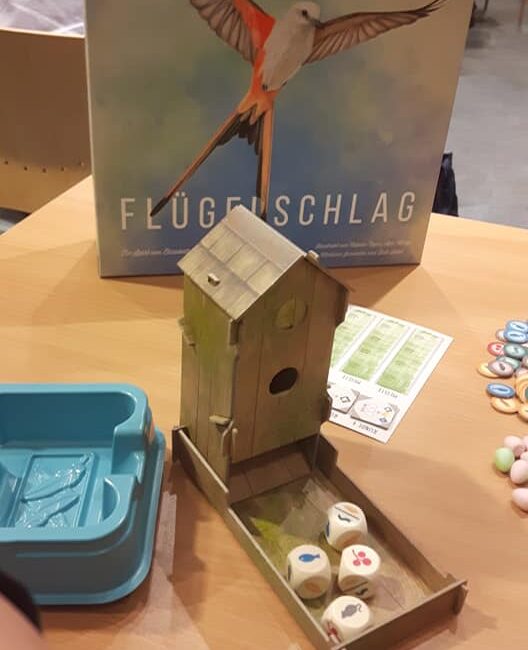Die Spielehighlights des heutigen Abend waren sicher das brandneue Spiel Flügelschlag, das in 2 Gruppen, einmal zu zweit, einmal zu fünft, die SpielerInnen begeisterte. Und Dr. Hans Hoeh hatte auch heute wieder neu kreative Prototypen im Gepäck, die den 6er Tisch über viele Stunden fesselten.
