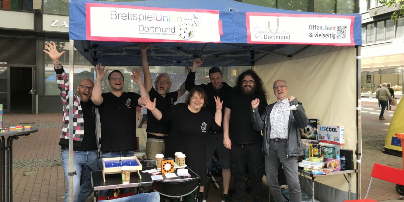 Auch die SpieleUnion Dortmund unterstützte dies. Mit dem Slogan “offen, bunt & vielseitig” wurde mitten in der Innenstadt am Platz von Netanya ein 3×3 Pavillon aufgebaut, der Menschen zum Spielen einlud. Und glaubt mir, es wurde viel gespielt. Fast ohne Pause begrüßten aktive Mitglieder und Unterstützer*innen der SpieleUnion und der BrettspielUnion Dortmund Menschen aller Klassen und spielten. Lachen, Anspannung, Freude und einfach eine schöne Zeit. Es war herrlich. Von Kindesalter an bis ins hohe über 80 – die Spiele auf den Tischen und am Stehtisch waren genau das Richtige und Passende für eine kleine Auszeit vom Einkaufsstress in der Innenstadt, oder eine willkommene Erholung zum Spaziergang an diesem Sonnen-Tag.