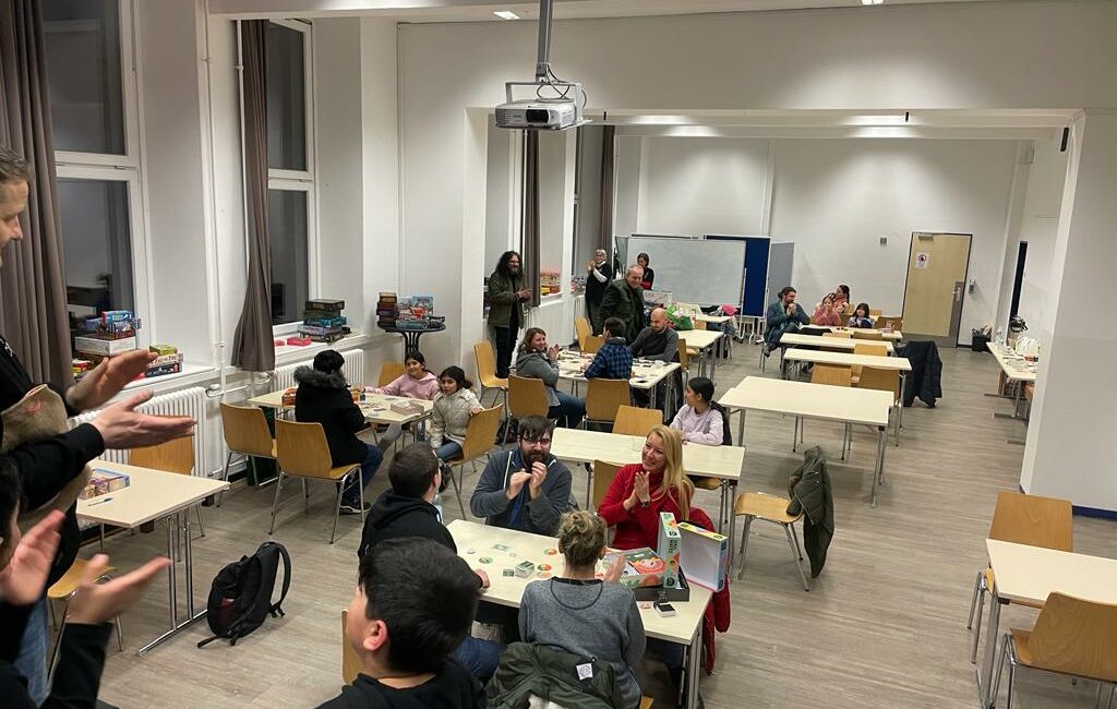 Mit dem Gong der Eröffnung standen die ersten Kinder und Familien in der Tür, und innerhalb von wenigen Minuten wurden an mehreren Tischen gleich drauflosgespielt. Die Besuchenden zeigten sich so bunt gemischt, wie die Spiele- und Schmaus-Auswahl selbst. Während einer französisch-sprechenden Familie an Tisch eins ein Kinderspiel vorgestellt und erklärt wurde, wurden nur 2 Tische weiter Spiele in einem Mix aus deutsch-englisch und etwas türkisch erklärt. Besonders die jüngeren Besuchenden waren interessiert und einige kannten sogar so manches mitgebrachte und ausliegende Spiel. So ergab es sich, dass so manche (vor allem) Kinder selber schnell als Spielerklärende sich herausstellten, die anderen Kindern bis Älteren Spiele erklärten und präsentierten. Das war wirklich toll mitzuerleben.